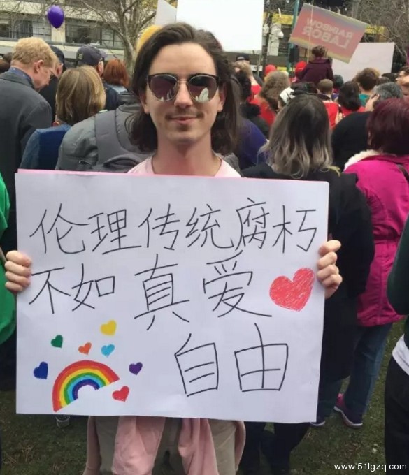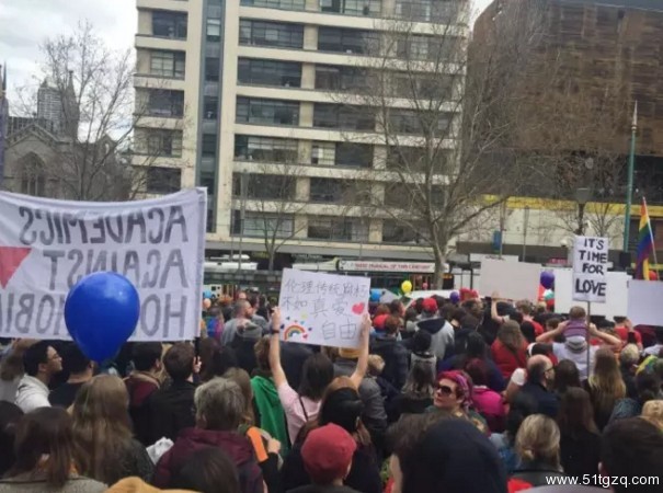 近日,澳大利亚墨尔本正在街头为#同性婚姻合法化#公投宣传招势。澳大利亚#同性婚姻#邮寄式公民投票即将于9月正式启幕。人群中惊现手持中文标语的老外。标语上绘有10色彩虹(代表所有性少数人群),写着:动摇异性恋婚姻制度还有很长的路要走;伦理传统腐朽,不如真爱自由。