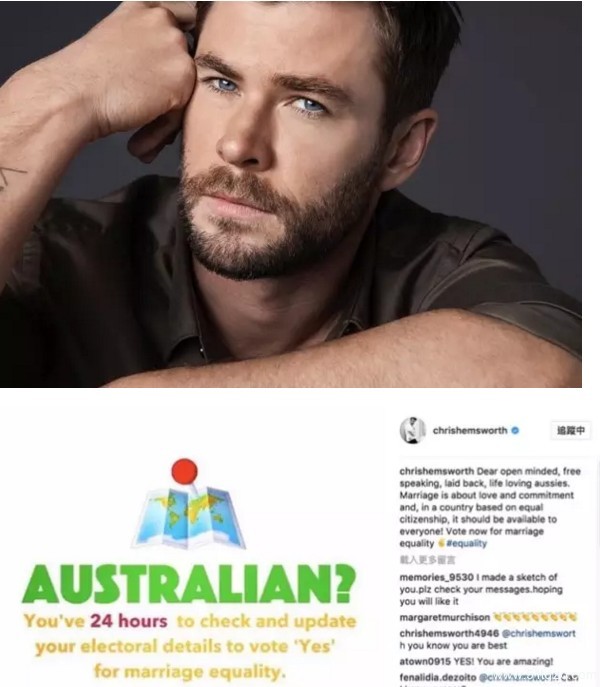 澳洲的#婚姻平权#议题持续发烧,支持与反对的阵营两方战火激烈,甚至出现互相攻击等情形。“雷神”克里斯·海姆斯沃斯在个人IG上po文呼吁家乡的民众们要支持,他写道:“婚姻是有关于爱与承诺,这应该是一个国家最基本的公民权利,这权利应该是属于每一个人的,请大家支持婚姻平权。”